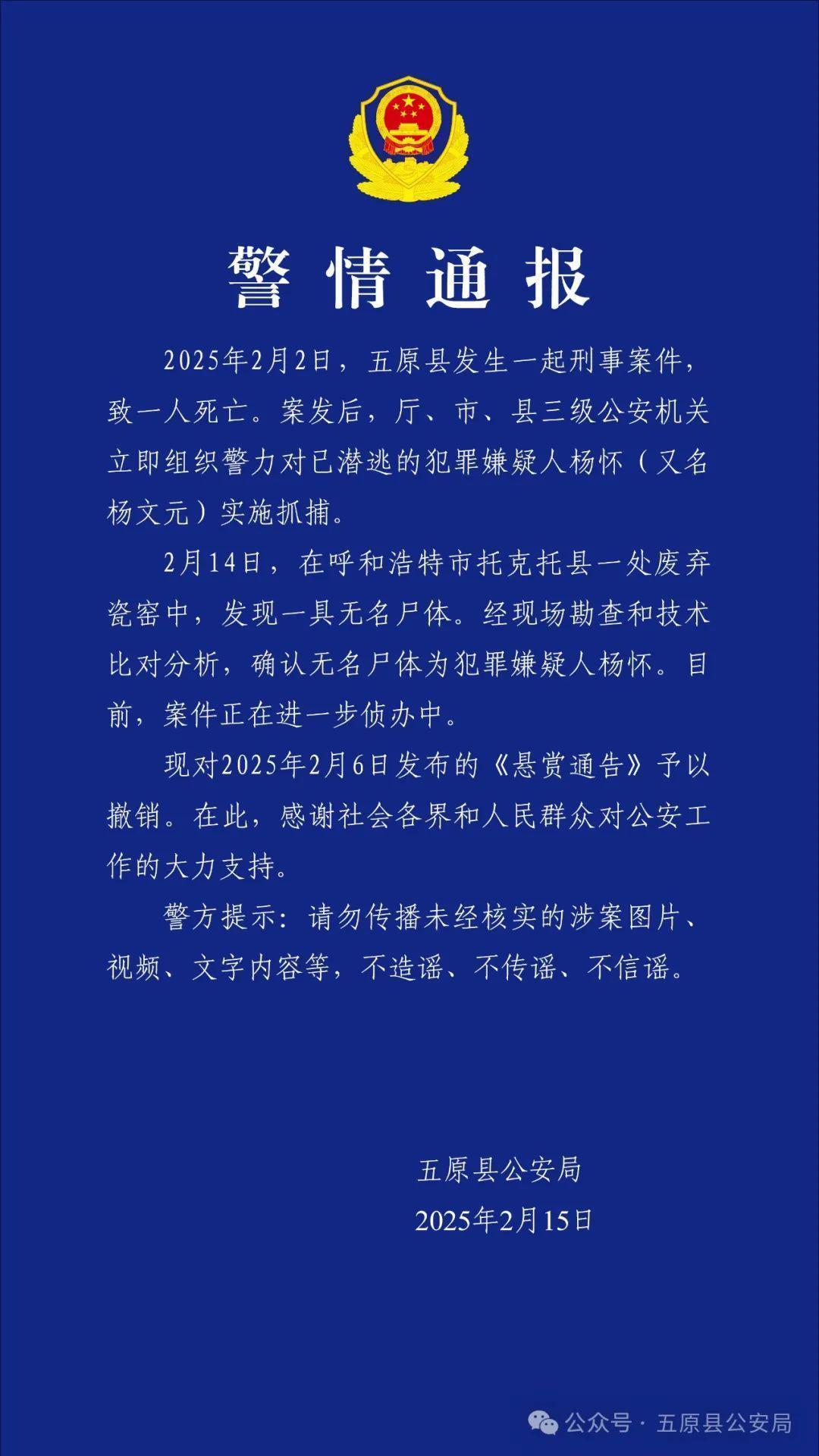 2月15日,内蒙古五原县公安局微信公众号发布警情通报: 2025年2月2日,五原县发生一起刑事案件, 致一人死亡。 案发后,厅、市、县三级公安机关立即组织警力 对已潜逃的犯罪嫌疑人杨怀(又名杨文元)实施抓捕。 2月14日,在呼和浩特市托克托县一处废弃瓷窑中,发现一具无名尸体。经现场勘查和技术比对分析, 确认无名尸体为犯罪嫌疑人杨怀。目前,案件正在进一步侦办中。